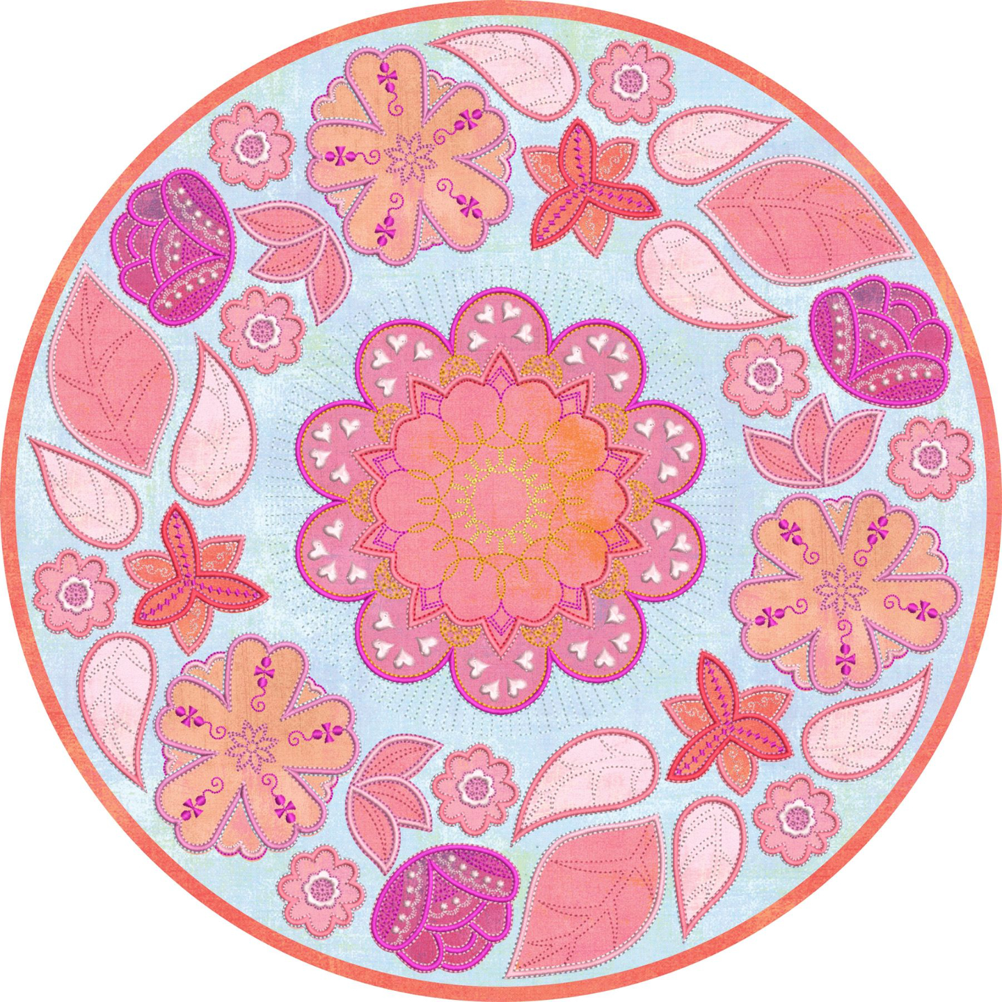 A beautiful border featuring 4 flowers and 5 leaves dancing in a circle of springtime joy. Choose from two colorway options: the vibrant multi-color shown, or a softer pink-and-coral palette.