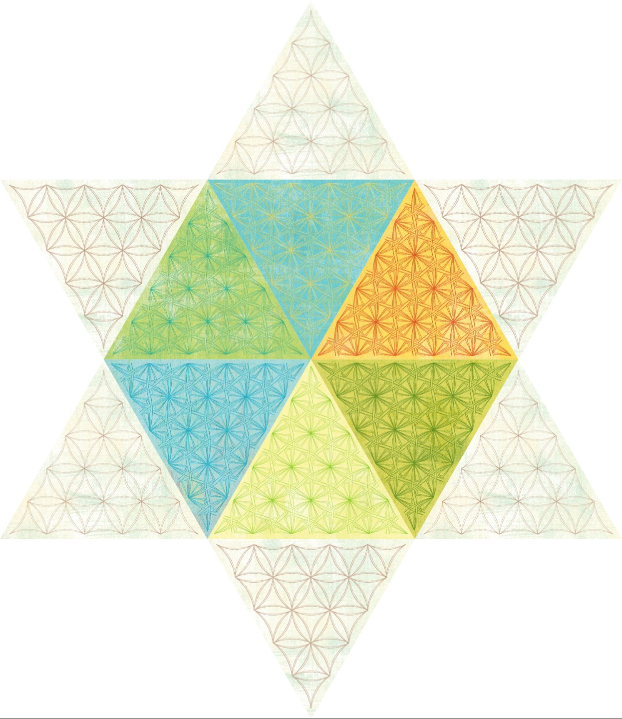 - Six-pointed stars bloom where triangles meet